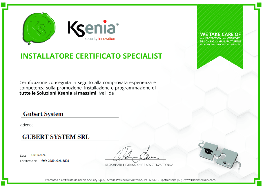 2023 – GUBERT SYSTEM diventa INSTALLATORE CERTIFICATO KSENIA, brand leader in Sistemi d’allarme e domotica.